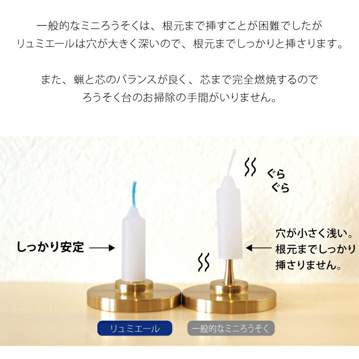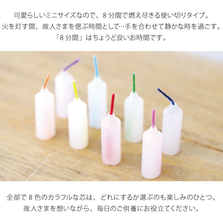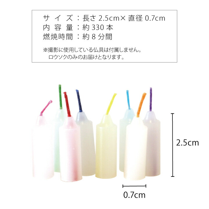 TOP ろうそく家庭用ろうそく 国産 ロウソク 8分間で燃え尽きる 大容量 ミニ ろうそく 仏壇 カラフル芯 リュミエール ミニ寸ろうそく 仏具 供養 手元供養 お悔やみ 蝋燭 ミニサイズ たっぷり 箱 仏具 小さい かわいい 終活 赤ちゃん 価格: ¥1,650 (税込) [ポイント還元 16ポイント〜] 販売期間: 22: 2: 数量: 個 在庫: 在庫あり 在庫 在庫あり 返品についての詳細はこちら おすすめのロウソク立てはこちら ⇒ロウソク立て一覧はこちら ⇒ロウソク一覧はこちら サイズ 直径:0.7cm×長さ2.5cm×深さ2cm 内容量 約330本 燃焼時間 約8分間 備考 ※撮影に使用している仏具は付属しません。ロウソクのみのお届けとなります。 ⇒掛け紙対応 専用ギフト商品はこちら⇒ラッピングサービスはこちら