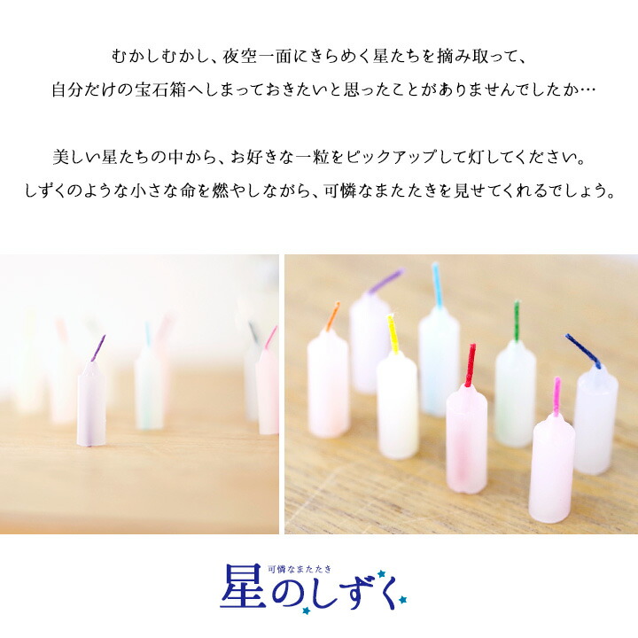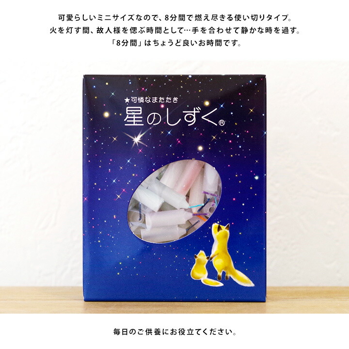 TOP ろうそく家庭用ろうそく ミニ ろうそく 約8分間燃焼 星のしずく かわいい ロウソク ミニ寸 仏具 自宅用 メモリアル 手元供養 お悔やみ 蝋燭 赤ちゃん 子供 ミニサイズ キャンドル ロウソク ローソク 可愛い 供養 仏具 水子供養 お供え 人間 終活 赤ちゃん 子供 価格: ¥550 (税込) [ポイント還元 5ポイント〜] 販売期間: 22: 2: 数量: 個 在庫: 在庫あり 在庫 在庫あり 返品についての詳細はこちら サイズ 直径:3.5cm×長さ2.5cm×深さ2cm 内容量 約100本 燃焼時間 約8分間 備考 ※撮影に使用している仏具は付属しません。ロウソクのみのお届けとなります。 variation おすすめのロウソク立てはこちら ⇒ロウソク立て一覧はこちら ⇒ロウソク一覧はこちら ⇒掛け紙対応 専用ギフト商品はこちら⇒ラッピングサービスはこちら
