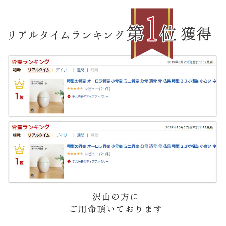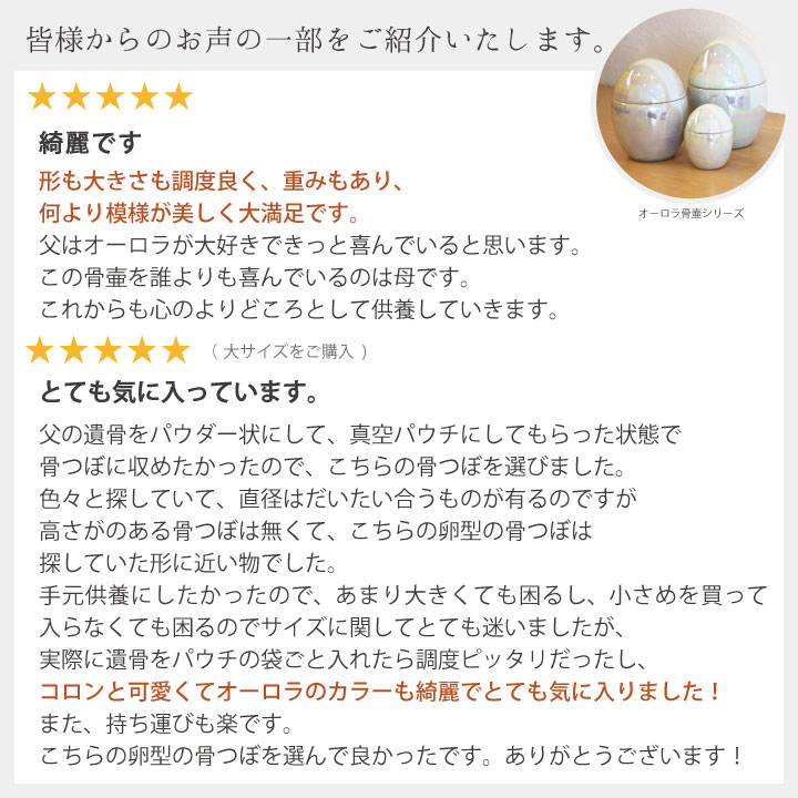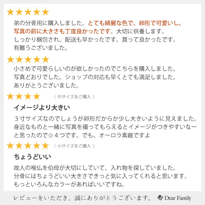 故人とずっと一緒にいたい、でも遺骨をばらばらにしてしまうのは良いことなのか、供養にならないのではないか?と不安に思われる方もいらっしゃるかもしれませんね。 仏教の考えでは、分骨は決して間違ったことではありません。 お釈迦様が亡くなったとき、8人の弟子に分骨をし、この8つに分けた骨が、やがて八大霊塔に祀られ、これが寺院の起源になったと伝えられています。 また、地域によっては分骨が習慣化されているところもあります。 一番大切なのは、故人を想うお気持ちだと思います。カプセルに納めて持ち歩いたり、小さな骨壷に納めてお部屋で一緒にすごすのも良いでしょう。 すでに納骨を済ませてしまった方も、ご遺骨を取り出すことはおおむね可能です。納骨を行ったお寺や霊園、石材店様に確認なさってください。 ●ご遺骨の納め方 こちらでご案内しているミニ骨壷は、ご遺骨のほか、遺髪や小さな思い出の品をお納めいただけます。 ご遺骨をお納めいただく場合に、適切な大きさのお骨が無い場合には、ティッシュや紙に包み、優しく手で押し、小さくしてお納めください。 また、ドライバーなどの特別な道具は必要ありません。ミニ骨壷の中に遺品を詰め、しっかりと蓋を閉めてください。 いずれのミニ骨壷も完全防水ではございませんので、水気のある場所でのご使用はお避け下さいませ。 |