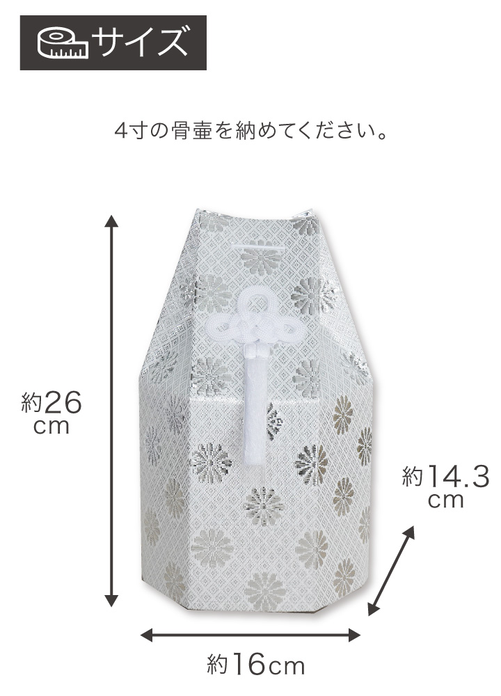 骨壷カバー本体:高さ 約26cm×横幅 約16cm×奥行き 約14.3cm 4寸骨壷サイズの目安:直径12×高14.5cm お手元に骨壷がある場合には、覆袋から出した状態でサイズを確認してください。 |