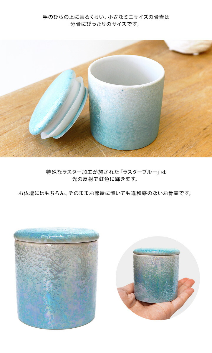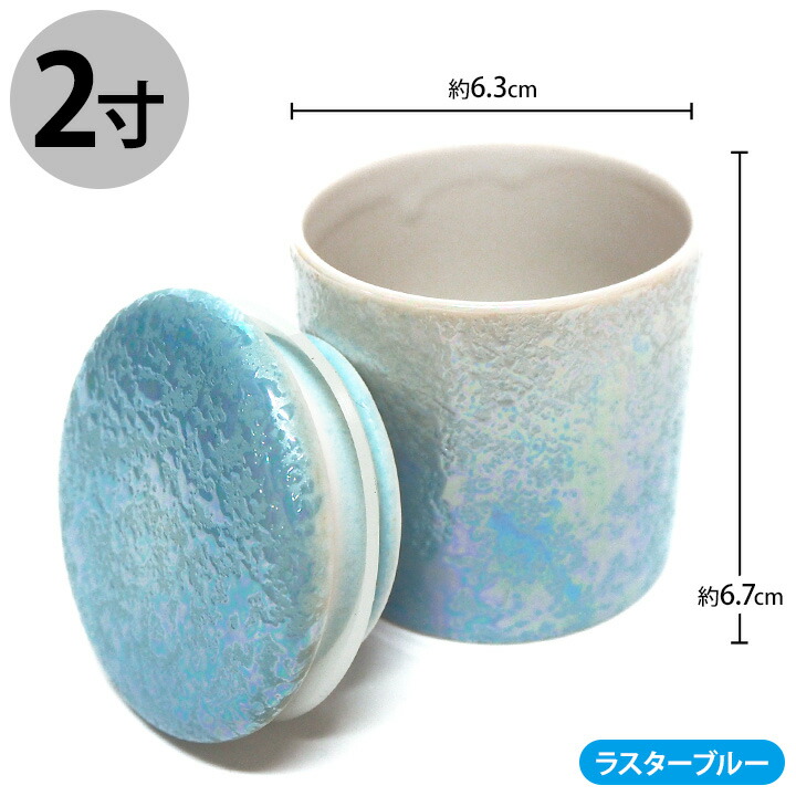 TOP 骨壷色から探す青系 骨壷素材から探す陶器製 国産 やわらぎ骨壷 2寸 ラスターブルー 青骨壷 ミニ骨壷 分骨 遺骨 骨 仏具 パッキン シリコン 供養 手元供養 お悔やみ 骨入れ やわらぎ オーロラ 光沢 陶器 小さい 可愛い おしゃれ 安心 ラスター ブルー 終活 ケース 入れ物 喉仏 天使ママ 価格: ¥3,780 (税込) [ポイント還元 37ポイント〜] 販売期間: 22: 2: 数量: 個 在庫: 在庫あり 在庫 在庫あり 返品についての詳細はこちら サイズ ■2寸 (内寸)直径5.7cm×深さ5.4cm (外寸)6.3cm×高さ6.7cm 色 ラスターブルー(オーロラのような加工がされています) 素材 陶器、シリコン 備考 ※撮影に使用している仏具や小物は付属しません。お骨壷のみのお届けです。■日本製(岐阜県) ⇒骨壷一覧はこちら ⇒仏具一覧はこちら