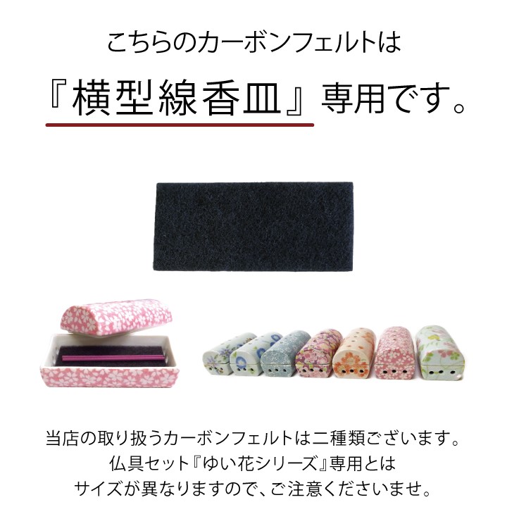 横型の線香皿を使用する際は、必ずカーボンフェルトを敷いて下さい。 カーボンフェルトを敷かずに火をつけたお線香を寝かせると、燃え尽きる前に火が消えてしまう場合がございます。