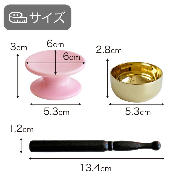 りん:直径 約5.3cm×高さ 約2.8cm りん台:直径 約6cm×高さ 約3cm りん棒:長さ 約13.4cm |