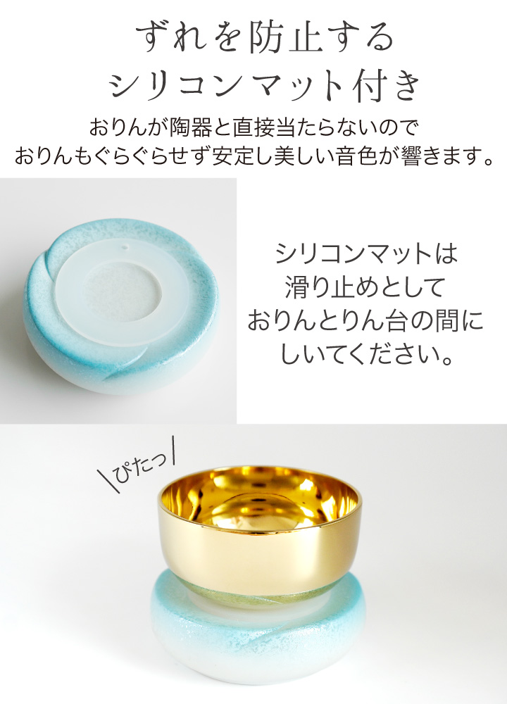 りん台はお花のような形が特徴。シリコンマット付きですので、おりんが陶器と直接あたらず、滑らずに安心してお使いいただけます。