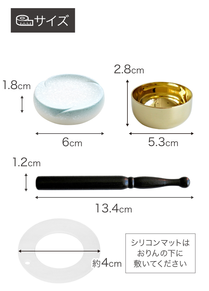 ・おりん(金属部分本体):直径 約5.3cm×高さ 約2.8cm ・りん台:直径 約6cm×高さ 約1.8cm ・シリコンマット:直径 約4cm ・りん棒:長さ 約13.4cm×直径 約1.2cm |