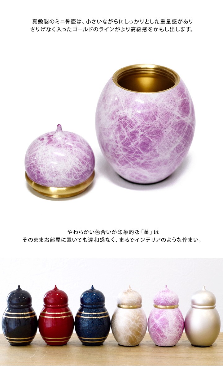 TOP 骨壷価格から探す価格10001〜30000円 骨壷素材から探す金属製 骨壷色から探す紫系 ミニ骨壷 心 こころ 菫 すみれ 安心の真鍮製 国産送料無料 骨壷 ミニ骨壷 分骨 遺骨 骨 仏具 骨入れ ケース 入れ物 人気 紫 パープル ラベンダー 綺麗 人気 終活 水子 水子供養 喉仏 天使ママ 手元供養 価格: ¥13,220 (税込) [ポイント還元 132ポイント〜] 販売期間: 2: 5: 数量: 個 在庫: 在庫あり 在庫 在庫あり 返品についての詳細はこちら サイズ 総高さ約8cm×本体高さ約5.1cm口径約2.8cm×胴約幅4.9cm 色 菫(むらさき) 素材 真鍮 備考 ■日本製(富山県)※撮影に使用している小物等はセットではございません。骨壷単品のみのお届けです。 variation ⇒骨壷一覧はこちら