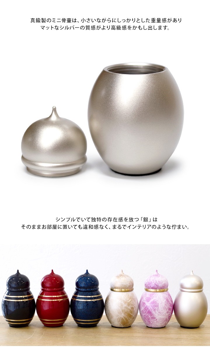 TOP 骨壷色から探すシルバー系 骨壷価格から探す価格10001〜30000円 骨壷素材から探す金属製 国産 ミニ骨壷 心 こころ 銀 ぎん 安心の真鍮製送料無料 骨壷 ミニ骨壷 分骨 遺骨 骨 仏具 シルバー 骨入れ ケース 入れ物 水子 水子供養 供養 終活 法要 喉仏 天使ママ 手元供養 価格: ¥13,220 (税込) [ポイント還元 132ポイント〜] 販売期間: お取り寄せ品のためご注文後のキャンセル・返品はできません: 選択してください 了承しました 2: 5: 数量: 個 在庫: 在庫あり 在庫 在庫あり 返品についての詳細はこちら サイズ 総高さ約8cm×本体高さ約5.1cm口径約2.8cm×胴約幅4.9cm 色 銀 素材 真鍮 備考 ■日本製(富山県)※撮影に使用している小物等はセットではございません。骨壷単品のみのお届けです。 variation ⇒骨壷一覧はこちら