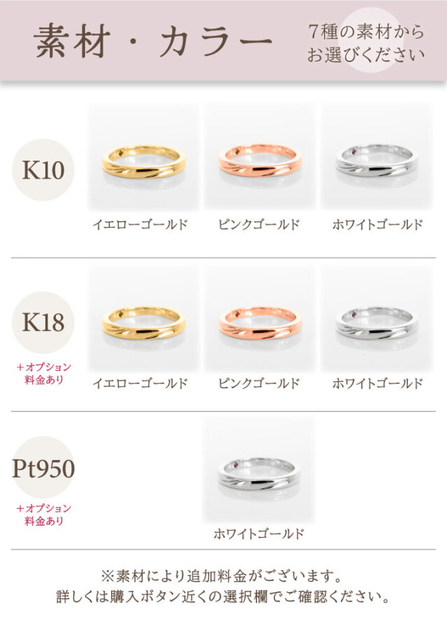 K10(イエローゴールド) K10(ピンクゴールド) K10(ホワイトゴールド)※ プラチナ950 K18(イエローゴールド) K18(ピンクゴールド) K18(ホワイトゴールド)※ ※=地金に対し銀白色のロジウムメッキを施したものになります。 プラチナ950はホワイトゴールドカラーのみ。ルテニウム(低アレルギー性金属)を2%配合し硬度を高めたプラチナ金属です。 |