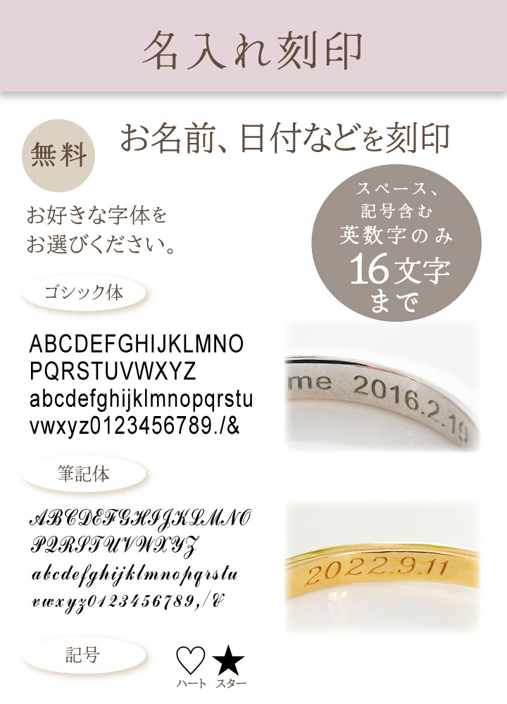 K10(イエローゴールド) K10(ピンクゴールド) K10(ホワイトゴールド)※ プラチナ950 K18(イエローゴールド) K18(ピンクゴールド) K18(ホワイトゴールド)※ ※=地金に対し銀白色のロジウムメッキを施したものになります。 プラチナ950はホワイトゴールドカラーのみ。ルテニウム(低アレルギー性金属)を2%配合し硬度を高めたプラチナ金属です。 |