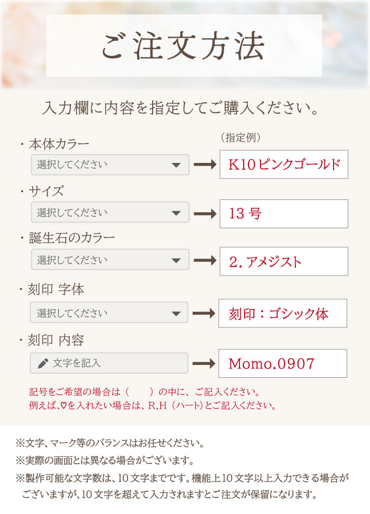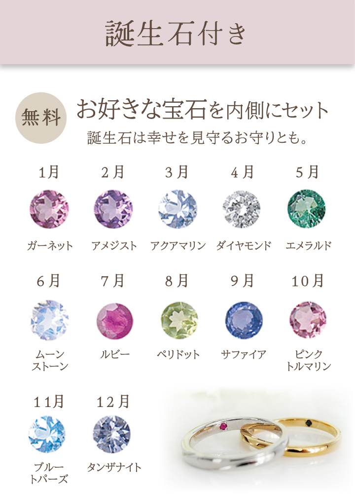 ガーネット/アメジスト/アクアマリン/ダイヤモンド/エメラルド/ムーンストーン/ルビー/ペリドット/サファイア/ピンクトルマリン/ブルートパーズ/タンザナイト リング内側にセットされます。 |