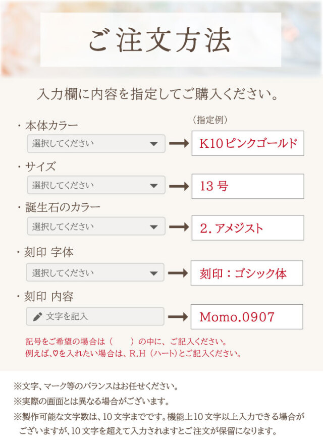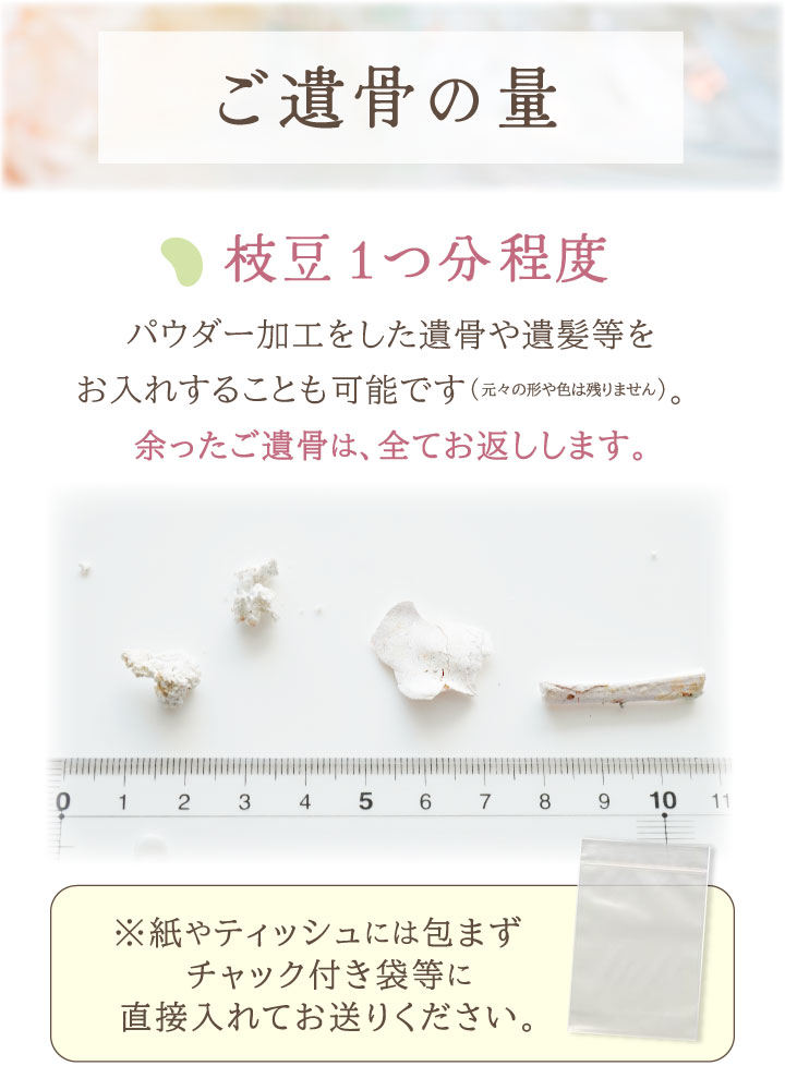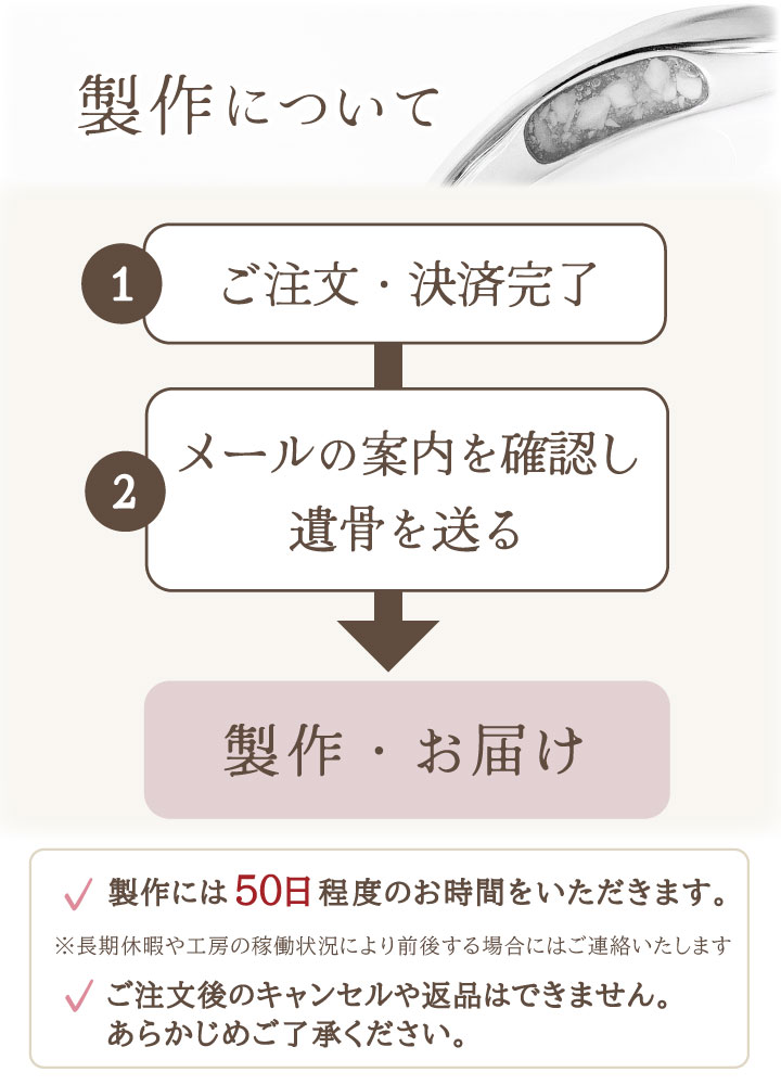 1.以下の項目を注文ボタンの近くの選択事項でご指定いただき、注文を完了させて下さい。 ------------------------ ・タイプ/素材 ・サイズ ・誕生石 ・刻印の字体、内容 ------------------------ ↓↓ 2.ご注文後、当店から制作についてのご案内メールをお送りいたします。 メールの案内にそって、ご注文者さまのお名前とご注文番号をお書き添えの上、当店までご遺骨をお送りください。 ・お送りいただくご遺骨の量:枝豆1粒分程度 ※納めきれなかったご遺骨は、完成したジュエリーと共にお戻しいたします。 ご遺骨のお送り先: 〒337-0051 埼玉県さいたま市見沼区東大宮2-38-6 TEL:048-780-2300 ディアファミリー オーダーメイド係 ※ご遺骨はご注文から1週間以内にお送りください。 期日を過ぎても当店に届かない場合、キャンセルの手続きをさせていただきます。 ↓↓ 3.遺骨の受取後、お店から連絡いたします。 お預かりしたご遺骨は職人に受け渡し、大切に加工いたします。 ↓↓ 4.お骨が弊店に到着してから「約50日前後」で完成し、お手元へお届けいたします。 ※長期休暇などの影響で、時期によっては表示されている納期よりも時間がかかる可能性がございます。ご命日や供養の節目などで希望の納期がある場合は、お日にちに余裕を持ってご注文ください。 |