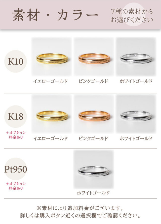 K10(イエローゴールド) K10(ピンクゴールド) K10(ホワイトゴールド)※ プラチナ950 K18(イエローゴールド) K18(ピンクゴールド) K18(ホワイトゴールド)※ ※=地金に対し銀白色のロジウムメッキを施したものになります。 プラチナ950はホワイトゴールドカラーのみ。ルテニウム(低アレルギー性金属)を2%配合し硬度を高めたプラチナ金属です。 |