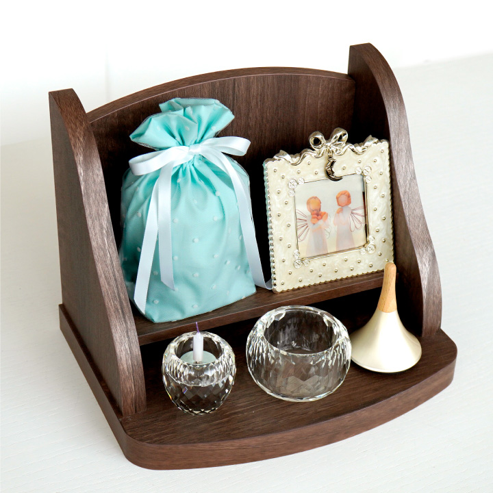 最大の横幅が約30cmとコンパクトなので、家族が集まるリビングや、棚の中などに置いていただきやすいサイズです。 一般的な大きなお仏壇と違い、開放された形なので、より身近に故人様を感じていただけるはず。