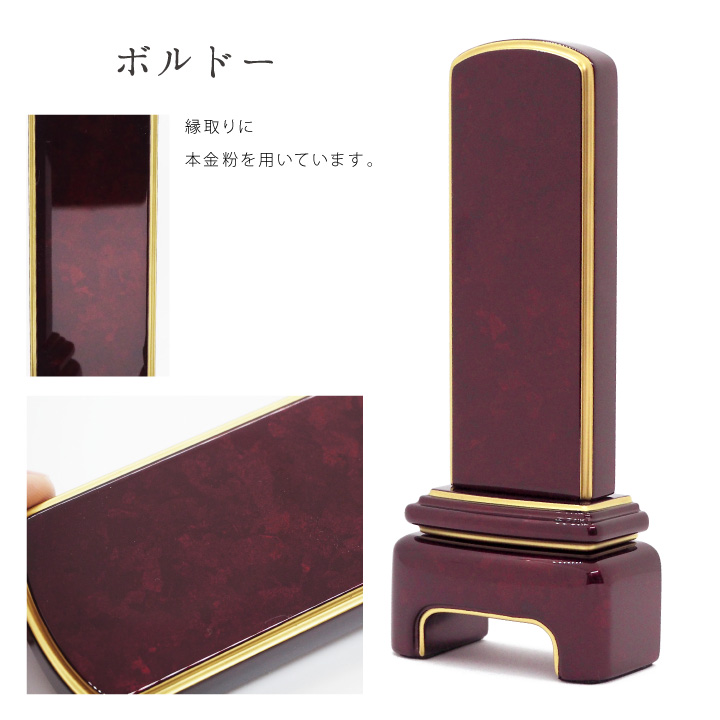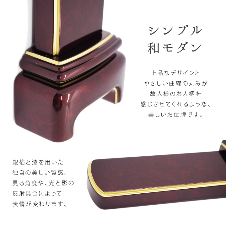 TOP 位牌名入れ部分の大きさから探す3.5寸(高さ10.6cm程度) 位牌モダン位牌 位牌価格で探す価格100001円以上 位牌シリーズ別漆塗位牌「モダン」 位牌 モダン 3.5寸 名入れ無料仏具 モダン 現代位牌 49日 法要 名入れ 彫刻 名前 戒名 梵字 終活 供養 水子 水子供養 本位牌 赤 青 紫 銀 シルバー 箔 白 価格: ¥194,700 (税込) [ポイント還元 1,947ポイント~] 販売期間: 位牌のレイアウト ※画像にてご参照下さい: 選択してください A(戒名位牌1)(¥0) B(戒名位牌2)(¥0) C(夫婦位牌1)(¥3,300) D(夫婦位牌2)(¥3,300) E(先祖位牌など)(¥0) F(俗名位牌など)(¥0) G(ペット位牌など)(¥0) H(備考欄へご記入下さい)(¥0) 梵字 ※画像にてご参照下さい: 選択してください (1)梵字なし (2)浄土真宗 (3)浄土宗 (4)天台宗、真言宗 (5)禅宗 (6)法華宗、日蓮宗 (7)曹洞宗、臨済宗 (8)子供 ご記入頂いた通りに製作いたします: 選択してください 了承しました オーダー品のためご注文後のキャンセル・返品はできません: 選択してください 了承しました 16: 5: 数量: 個 色在庫購入ブルーブラック在庫あり 白銀在庫あり ボルドー在庫あり いぶし銀在庫あり 本紫在庫あり 色在庫購入ブルーブラック在庫あり 白銀在庫あり ボルドー在庫あり いぶし銀在庫あり 本紫在庫あり 返品についての詳細はこちら \キャンペーン中/ ↑↑こちらのページで位牌について詳しくご案内しています サイズ ■3.5寸高さ約15cm×幅約6cm×奥行き約3.8cm 文字 金色標準的な楷書体になります。(書体の変更は出来ません) 納期 ご注文後2週間ほどお時間を頂戴いたします。 備考 ※オーダーメイド品のため、ご返品はお受けできません。※ご承認のキャンセルはお受けいたしかねますのでご了承ください。 ※ご記入頂いた通りに製作いたします※戒名の霊位も、ご記入があればそのまま彫刻いたします。ご記入内容にお間違いがないよう、お気をつけ下さいませ。※彫刻内容を記載忘れた場合は【order@inlovingmemory.co.jp】に内容をお送りください。