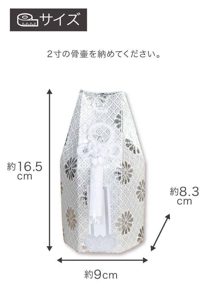骨壷カバー本体:高さ 約16.5cm×横幅 約9cm×奥行き 約8.3cm 2寸骨壷サイズの目安:直径約6cm、高さ7.5cm お手元に骨壷がある場合には、覆袋から出した状態でサイズを確認してください。 |