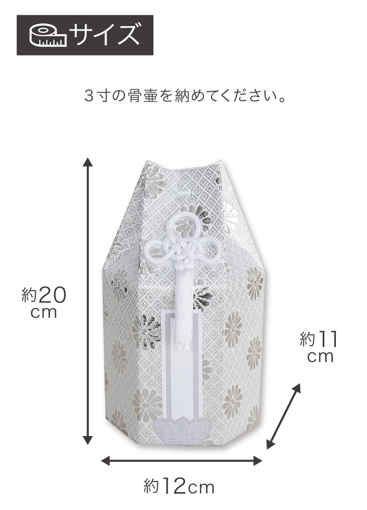 骨壷カバー本体:高さ 約20cm×横幅 約12cm×奥行き 約11cm 3寸骨壷サイズの目安:直径約9cm、高さ11cm お手元に骨壷がある場合には、覆袋から出した状態でサイズを確認してください。 |