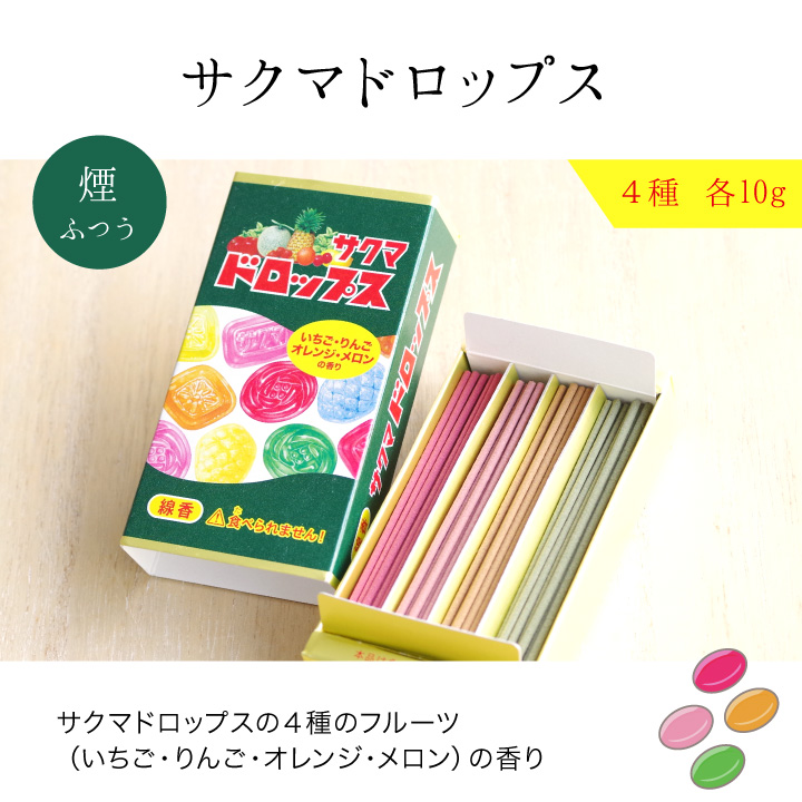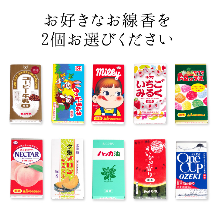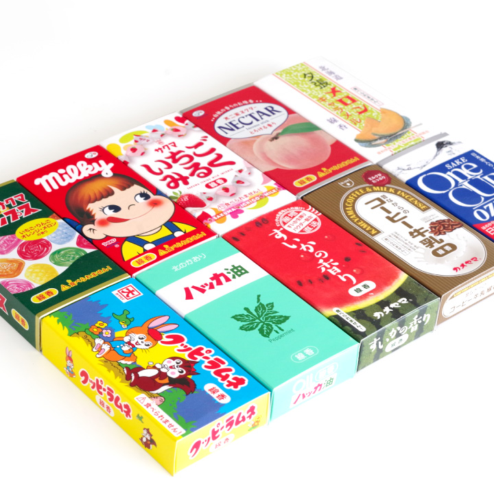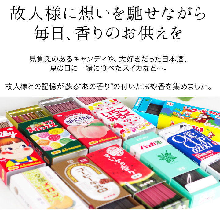 誰もが知っている有名なお菓子や飲み物、フルーツなどをモチーフにした香り付きのお線香です。