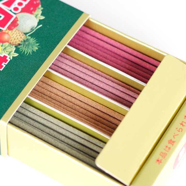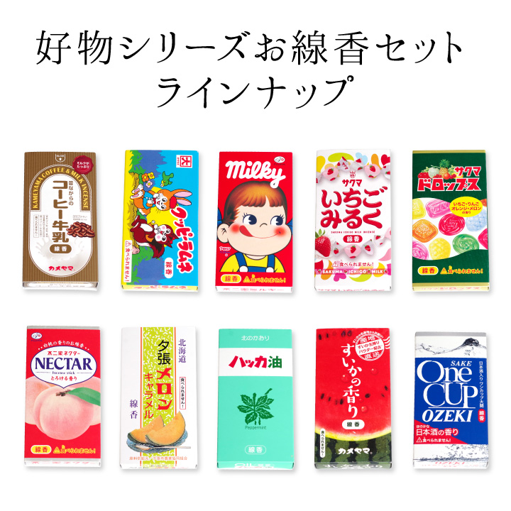 誰もが知っている有名なお菓子や飲み物、フルーツなどをモチーフにした香り付きのお線香です。
