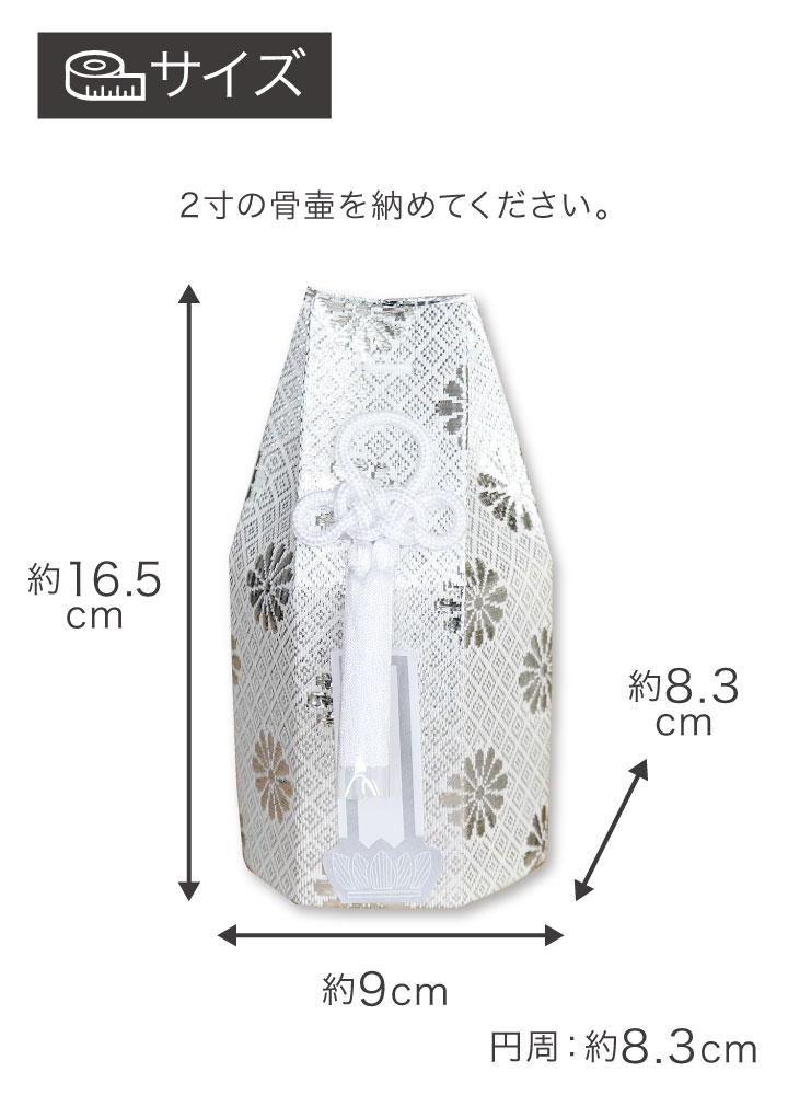 骨壷:2寸 直径約6cm、高さ7.5cm 骨袋:横幅 約9.4cm×高さ 約16.5cm×奥行き 約7.9cm お手元に骨壷がある場合には、覆袋から出した状態でサイズを確認してください。 ※お名前シール付き。お写真入れは付属していません。 |