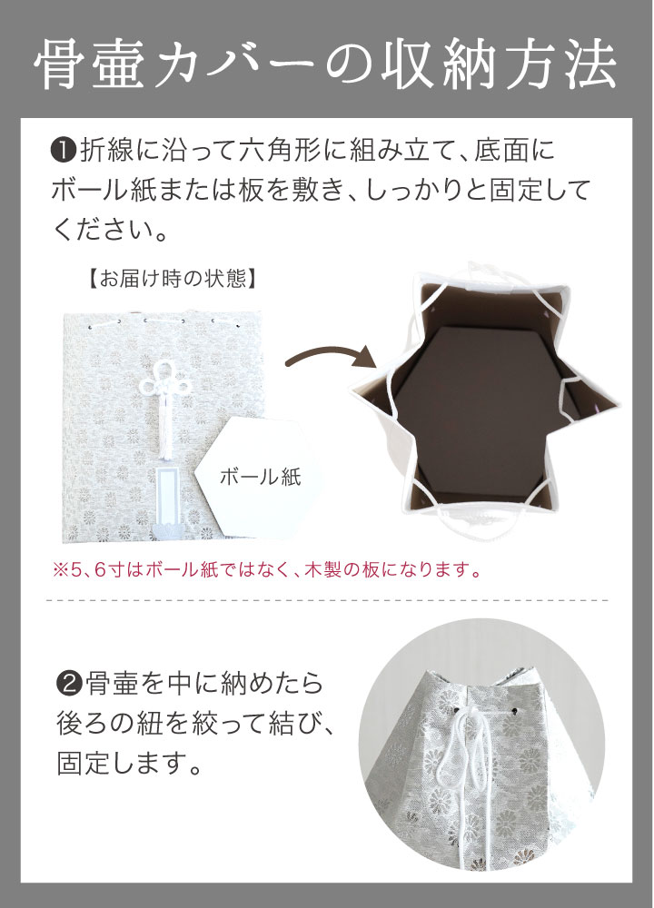 組立てていない状態で発送いたします。 ●組み立て方法 1.袋を六角形に組み立て、底にボール紙または板(付属)を敷きます。 2.骨壷をお納めしましたら、後ろの紐を引っ張りながら上部を閉め、紐を結びます。 ●ご使用上の注意 ・移動するときは底を持ってください。 |