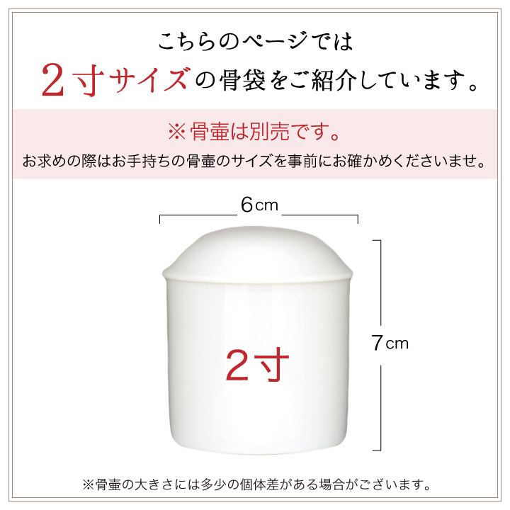 横幅 約9.4cm×高さ 約16.5cm×奥行き 約7.9cm・円周 約27.5cm サイズ:2寸の骨壷が納まるサイズです。 ○2寸骨壷サイズの目安:直径約6cm、高さ7.5cm お手元に骨壷がある場合には、覆袋から出した状態でサイズを確認してください。 ※お名前シール付き。お写真入れは付属していません。 |