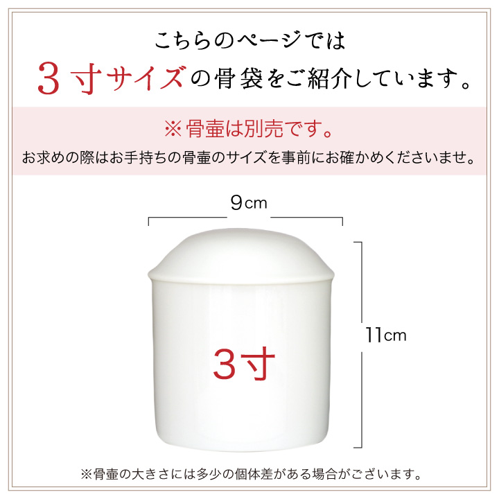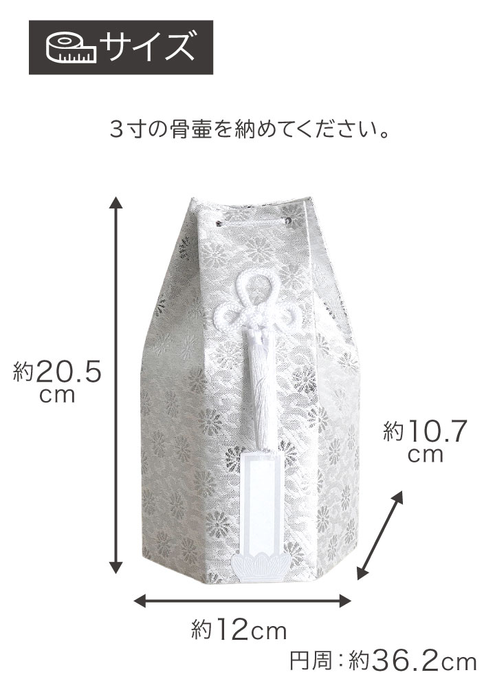 横幅 約12cm×高さ 約20.5cm×奥行き 約10.7cm・円周 約36.2cm サイズ:3寸の骨壷が納まるサイズです。 ○3寸骨壷サイズの目安:直径 約9cm、高さ11cm お手元に骨壷がある場合には、覆袋から出した状態でサイズを確認してください。 ※お名前シール付き。お写真入れは付属していません。 |