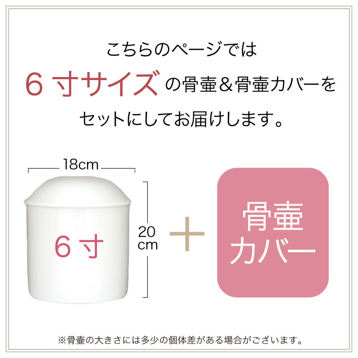 骨壷:6寸 直径18×高20cm 骨袋:横幅 約22cm×高さ 約38cm×奥行き 約20cm・円周 約67cm お手元に骨壷がある場合には、覆袋から出した状態でサイズを確認してください。 ※お名前シール付き。お写真入れは付属していません。 |
