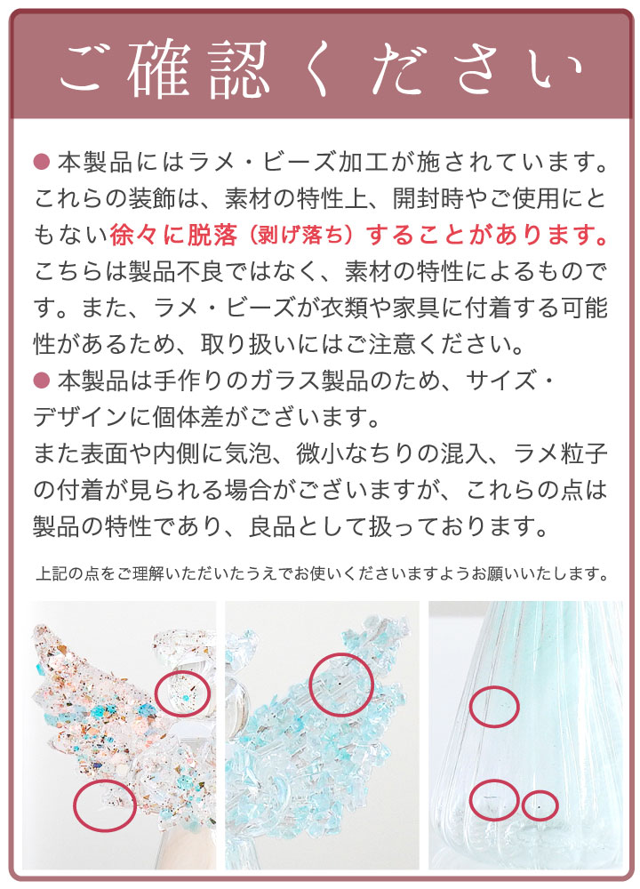 ※本製品にはラメ・ビーズ加工が施されています。これらの装飾は、素材の特性上、開封時やご使用にともない徐々に脱落(剥げ落ち)することがあります。こちらは製品不良ではなく、素材の特性によるものです。また、ラメ・ビーズが衣類や家具に付着する可能性があるため、取り扱いにはご注意ください。 ※本製品は手作りのガラス製品です。表面や内側に気泡、微小なちりの混入、ラメ粒子の付着が見られる場合がございますが、これらの点は製品の特性であり、良品として扱っております。 |