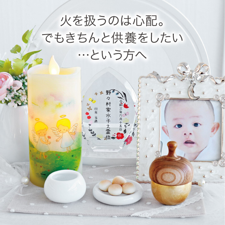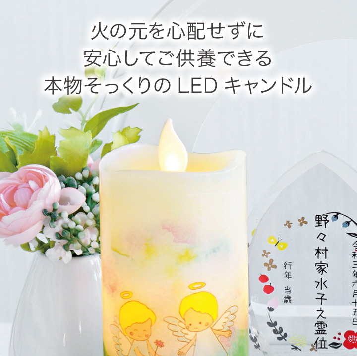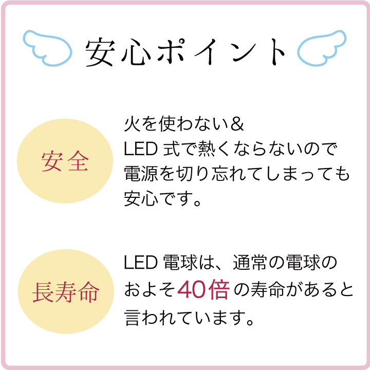 火を使わないから、安心・安全にお空の故人様のための明かりを灯していただけます。