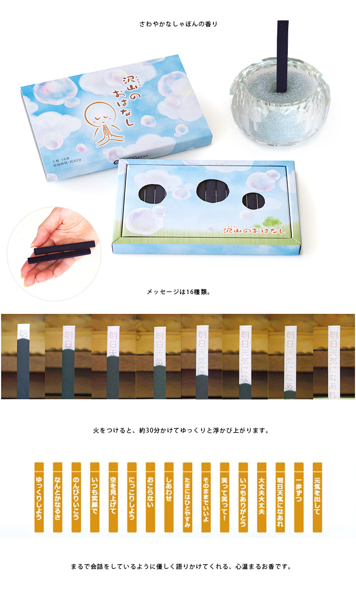 TOP 線香家庭用線香 線香ミニ寸線香(長さ9.5cm以下) 特集「父の日参り」のお供え 特集「母の日参り」のお供え 線香 沢山のおはなし 16本入 煙少ない ネコポス対応 仏壇 仏具 神具 線香 お香 かおり しゃぼん シャボン 石鹸 供養 お悔やみ お供え 49日 一周忌 メモリアル メッセージ ありがとう 価格: ¥1,650 (税込) [ポイント還元 16ポイント〜] 販売期間: 22: 1: 数量: 個 在庫: 在庫あり 在庫 在庫あり 返品についての詳細はこちら サイズ お香:約8cm 外箱:6cm×10cm×1.5cm 燃焼時間 約30分 煙の量 極少 香り しゃぼんの香り 本数 約16本 Variation. ⇒掛け紙対応 専用ギフト商品はこちら⇒ラッピングサービスはこちら