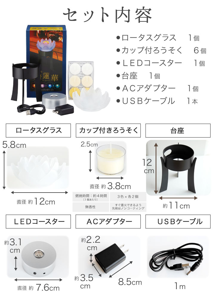 ◆電池式/USB&ACコード式の2wayでお使いいただけます。 (※電池は単4×3本使用。テスト用電池は付属していません) 【セット内容】 ・ロータスグラス 1個 ・カップ付ろうそく 6個 ・LEDコースター 1個 ・台座 1個 ・ACアダプター 1個 ・USBケーブル 1本 【ろうそくの燃焼時間】 1個あたり約4時間 ※無香料 メーカー保証期間:お届けから3ヵ月 |