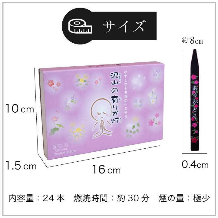 ■沢山の有りが灯線香 1箱 【サイズ、燃焼時間等】 ・長さ 約8cm×横幅 約0.4cm ・24本入り ・燃焼時間 約30分(お使いになる環境により前後します) ・煙の少ないタイプです ・ケース:縦 10cm×横 16cm×厚さ 1.5cm ■沢山の有りが灯ろうそく 1箱 【サイズ、燃焼時間等】 ・ろうそく:長さ 約4cm×直径 約0.7cm ・36本入り ・燃焼時間 約15分(お使いになる環境により前後します) ・ケース:縦 10cm×横 16cm×厚さ 1.5cm 専用外装箱に入れてお届けします。 |