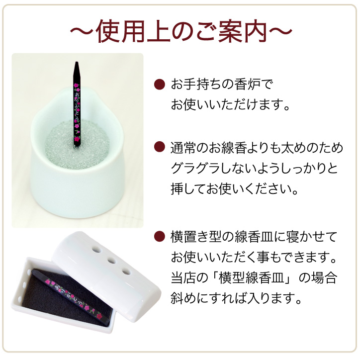 ■国産(日本製) 線香: 1月 梅 2月 雪割草(ゆきわりそう) 3月 菜の花 4月 桜 5月 つつじ 6月 花菖蒲(はなしょうぶ) 7月 蓮 8月 向日葵(ひまわり) 9月 秋桜(こすもす) 10月 りんどう 11月 菊 12月 水仙(すいせん) ろうそく: 「沢山の有りが灯」「かんしゃ」「おかげさま」の文字入り |