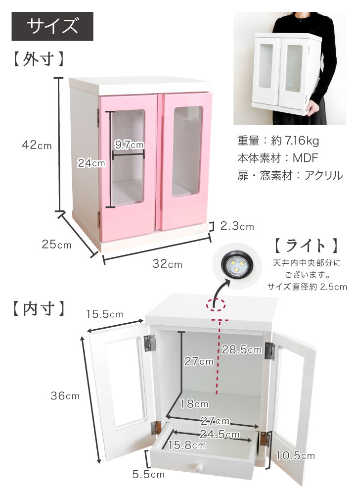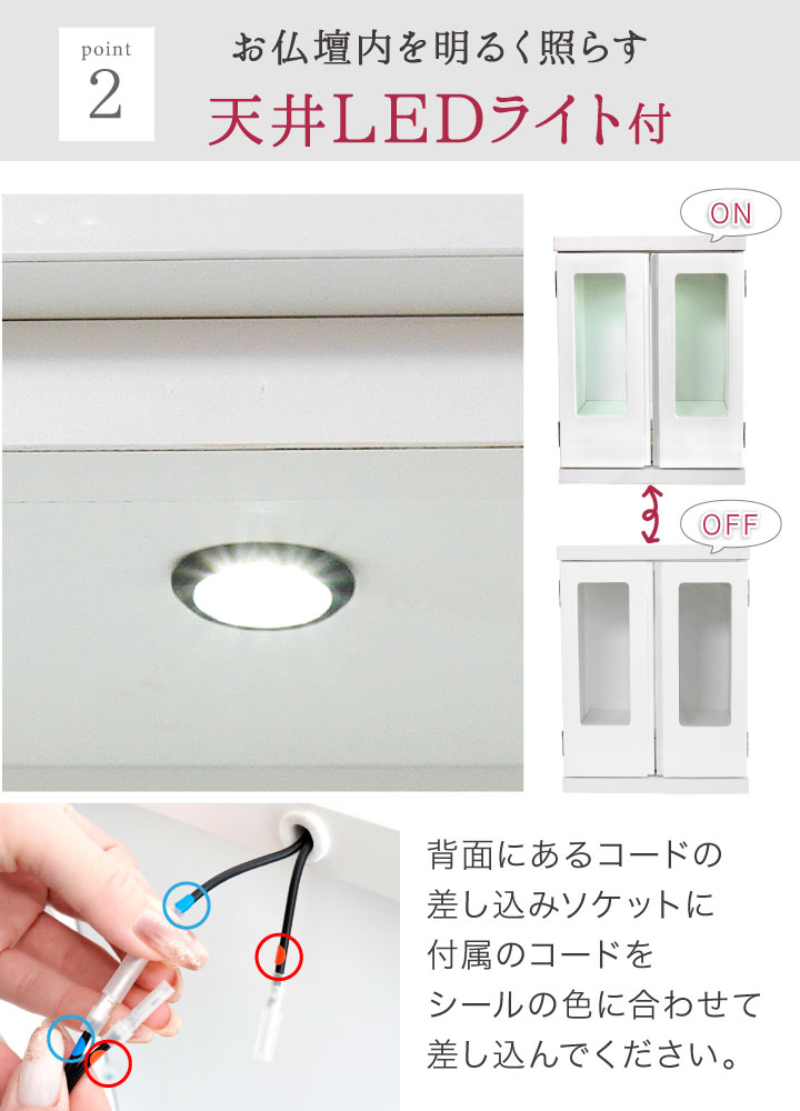 外寸:横幅 約32cm×高さ 約42cm×奥行き 約25cm 内寸(骨壷収納部):横幅 約27cm×高さ 約27cm×奥行き 約18cm 引き出し内部:横幅 約24.5cm×高さ(深さ) 約5.5cm×奥行き 約15.8cm 扉サイズ(片側):横幅 約15.5cm×高さ 約36cm 窓枠サイズ(片側):横幅 約9.7cm×高さ 約24cm 天井ライト:直径 約2.5cm 仏壇の重量:約7.16kg |