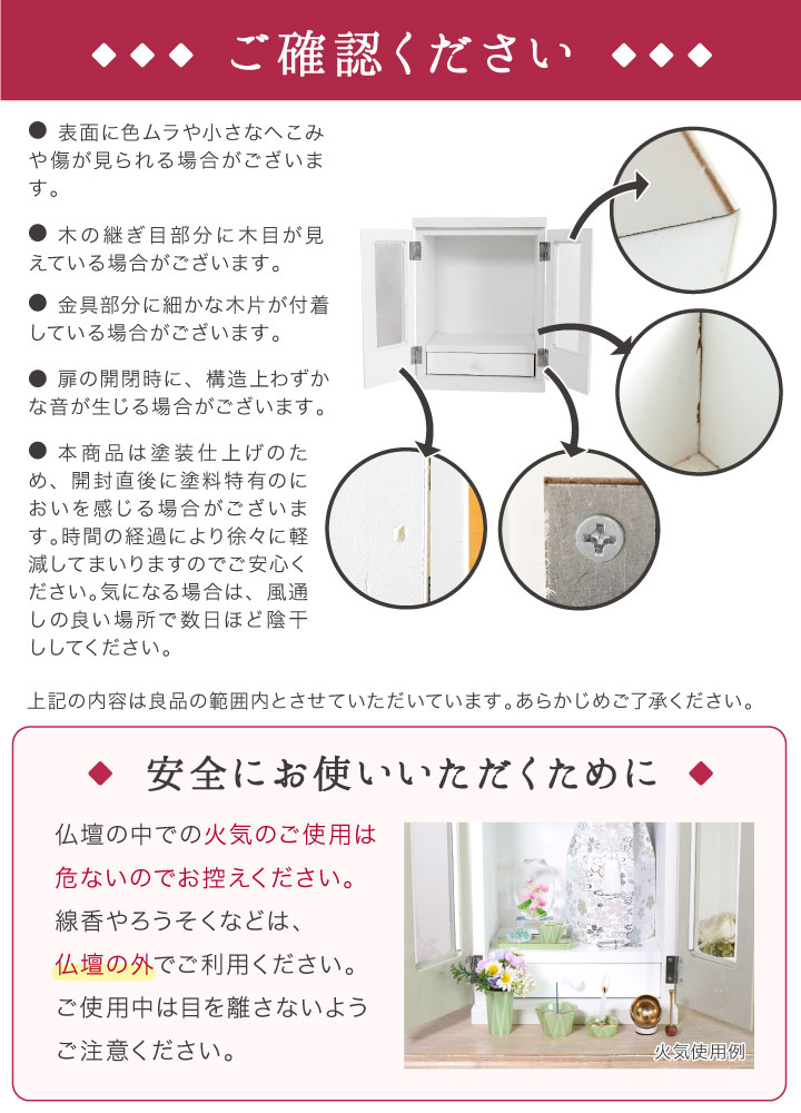 ※ 表面に色ムラのような模様や点のような小さな突起がございます。 ※ 木の継ぎ目部分に木目が見えている場合がございます。 ※ 金具部分に細かな木片が付着している場合がございます。 ※ 扉の開閉時に、構造上わずかな音が生じる場合がございます。 ※ 本商品は塗装仕上げのため、開封直後に塗料特有のにおいを感じる場合がございます。時間の経過により徐々に軽減してまいりますのでご安心ください。気になる場合は、風通しの良い場所で数日ほど陰干ししてください。 【安全にお使いいただくために】 仏壇の中での火気のご使用は危ないのでお控えください。 線香やろうそくなどは、仏壇の外でご利用ください。また、ご使用中は目を離さないようご注意ください。 |