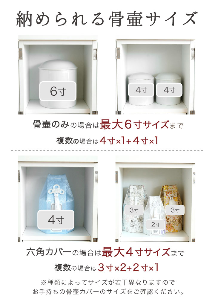 ■骨壷のみ: 最大6寸(直径18cm×高さ20cm)まで。 〇可能 ・5寸×1+3.5寸×1+2寸×2 ・4寸×2 ・4寸×1+3寸×2 ■六角形の骨壷カバーに納めた状態: 最大4寸のカバー(おおよその目安→横幅16cm×高さ25.5cm)まで。 六角形の骨壷カバーは種類によりサイズが異なりますので、必ずお手持ちのカバーのサイズをご確認ください。 〇可能 ・4寸×1+3寸×1 ・3寸×2+2寸×1 ・3.5寸×2 |