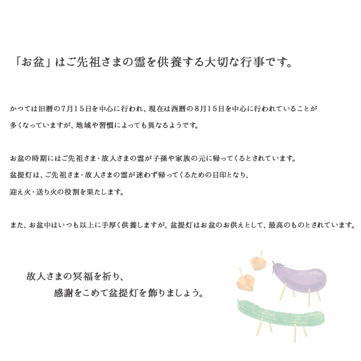 盆提灯はお盆のとき、先祖や故人の霊が迷わず帰ってくる目印(迎え火)として飾ります。 ◆盆提灯を飾る時期
