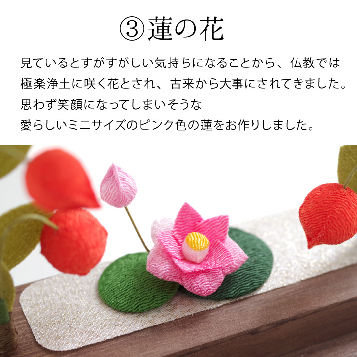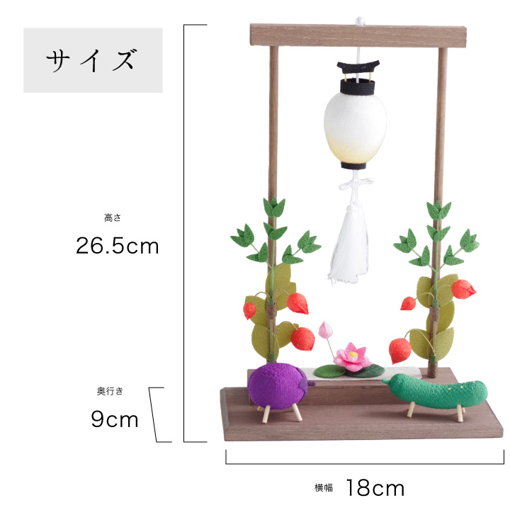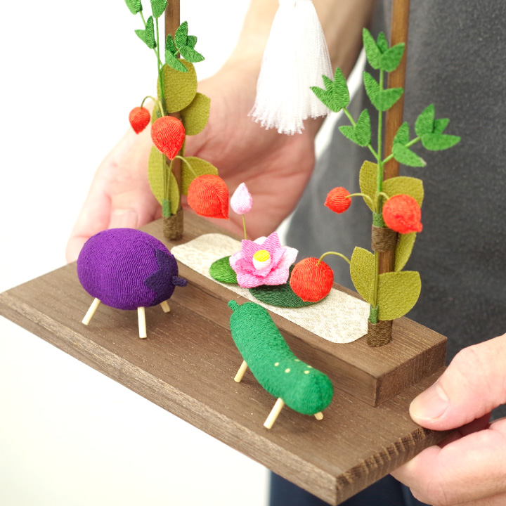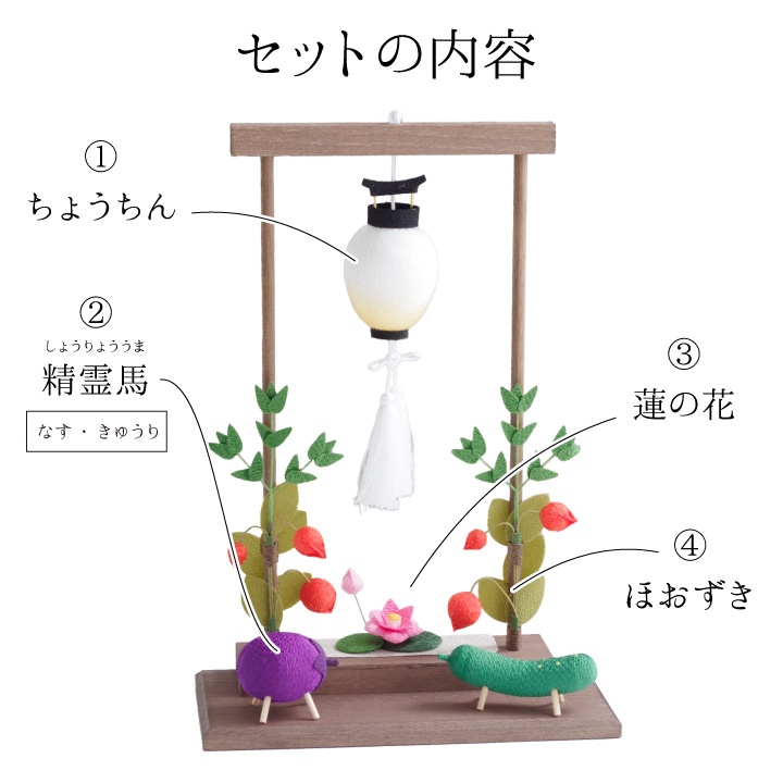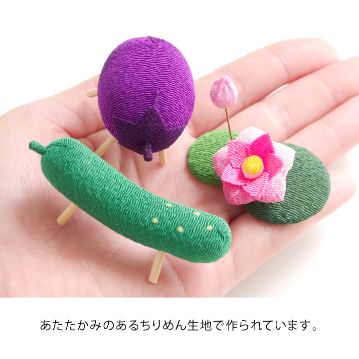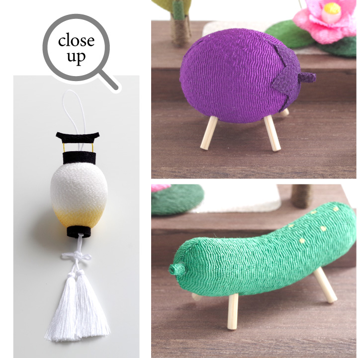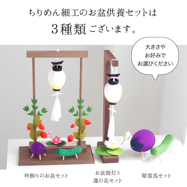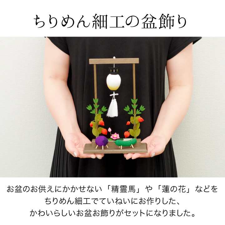 こちらのセットは、 「盆ちょうちん」や「精霊馬」などの、お盆供養にかかせないご供養品を かわいいミニチュアサイズのちりめん細工でお作りしたお品物です。
