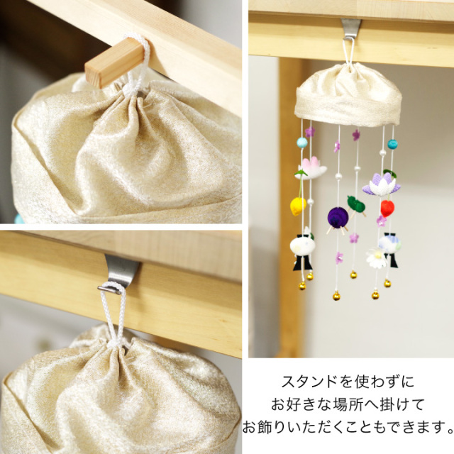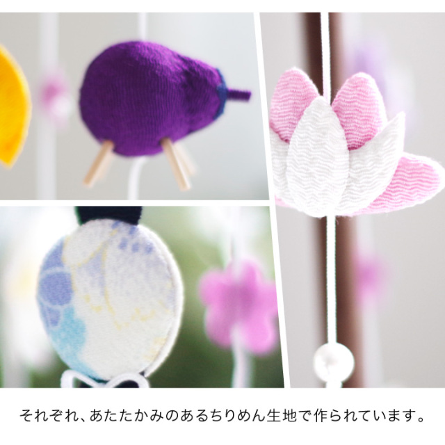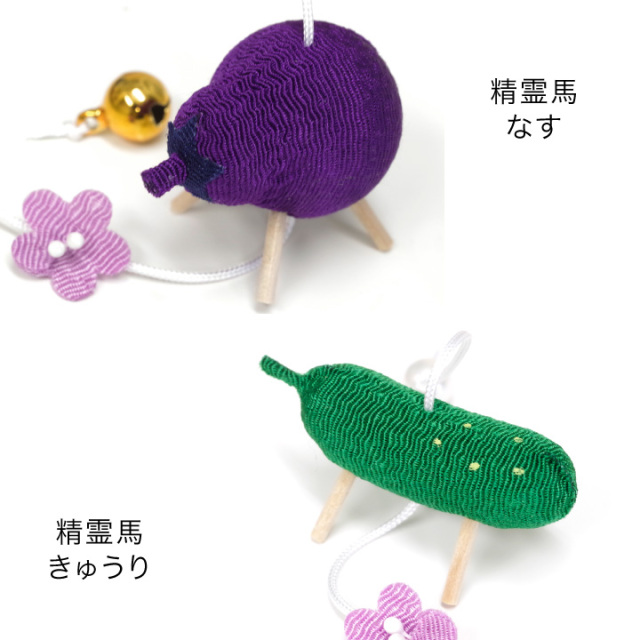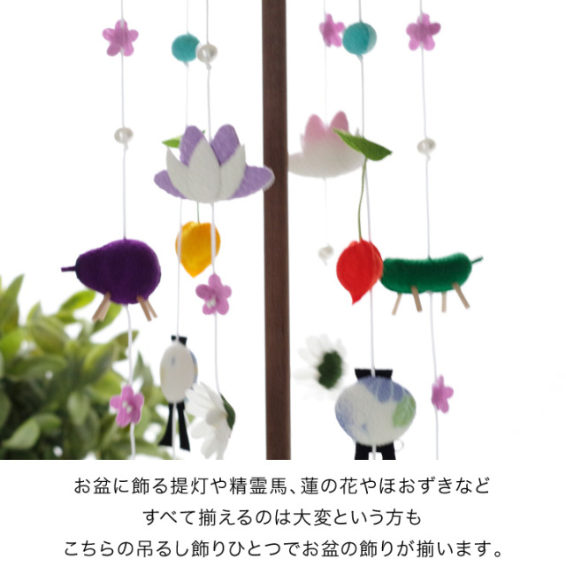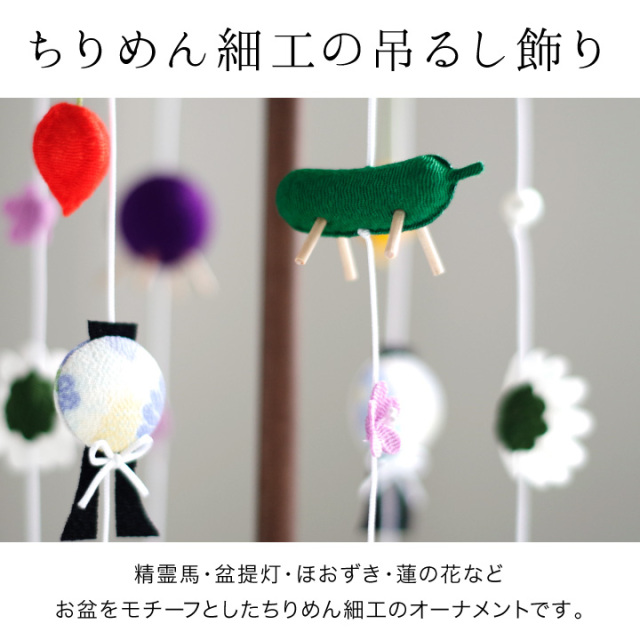 精霊馬やほおずきなど、お盆にかかせないご供養品をモチーフにして ちりめんでかわいくお作りした、お供えの吊るし飾りです。