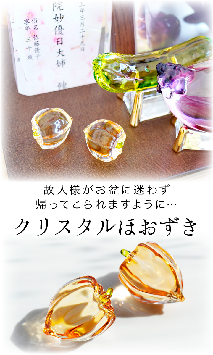 故人様が迷わず帰ってこれるように飾りたいかわいいほおずき飾りを、涼しげなクリスタルガラスでお作りしました◎