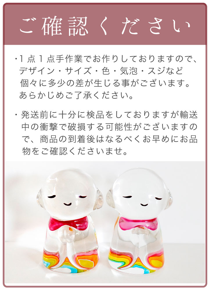 【個体差について】 人の手でひとつずつ作っているため、サイズ・色・気泡・スジなど個々に多少の差が生じる事がございますが、当店の判断基準のもと良品としてお届けさせていただきます。 お品物の性質上、いたしかたないものとしてあらかじめご了承ください。 またガラス製品のため、落としたり無理な力を加えると破損する恐れがございます。 |