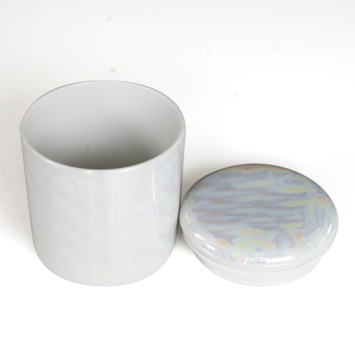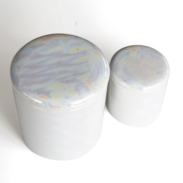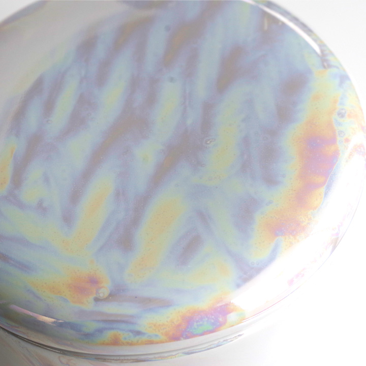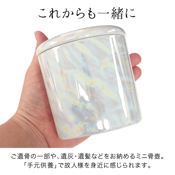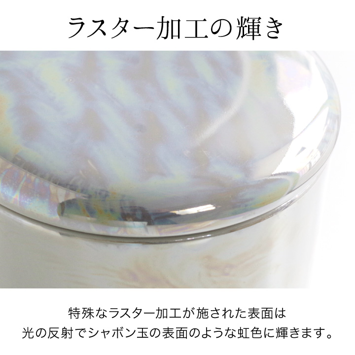 光の加減で虹色にきらめくお色味が美しい、国産・美濃焼の骨壷です。