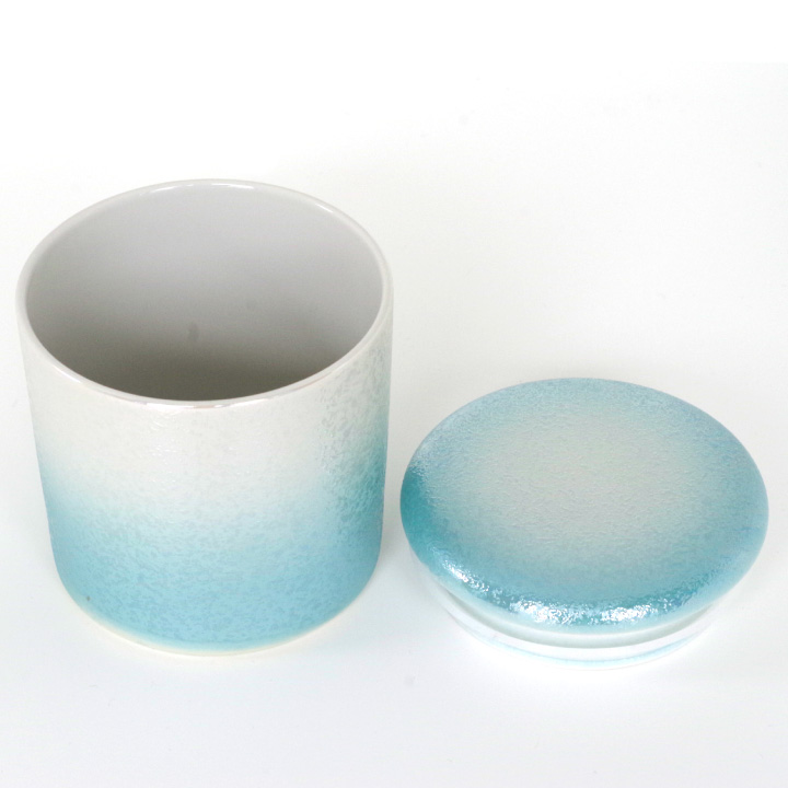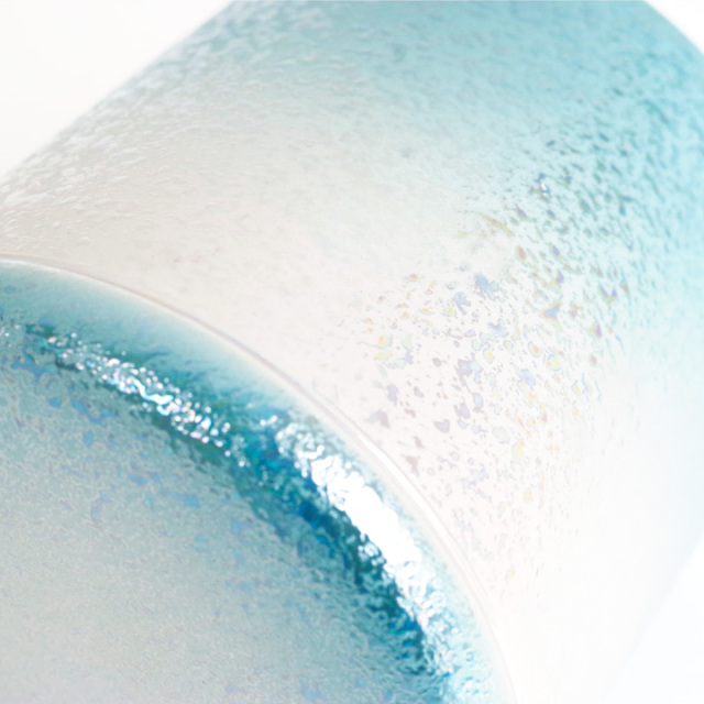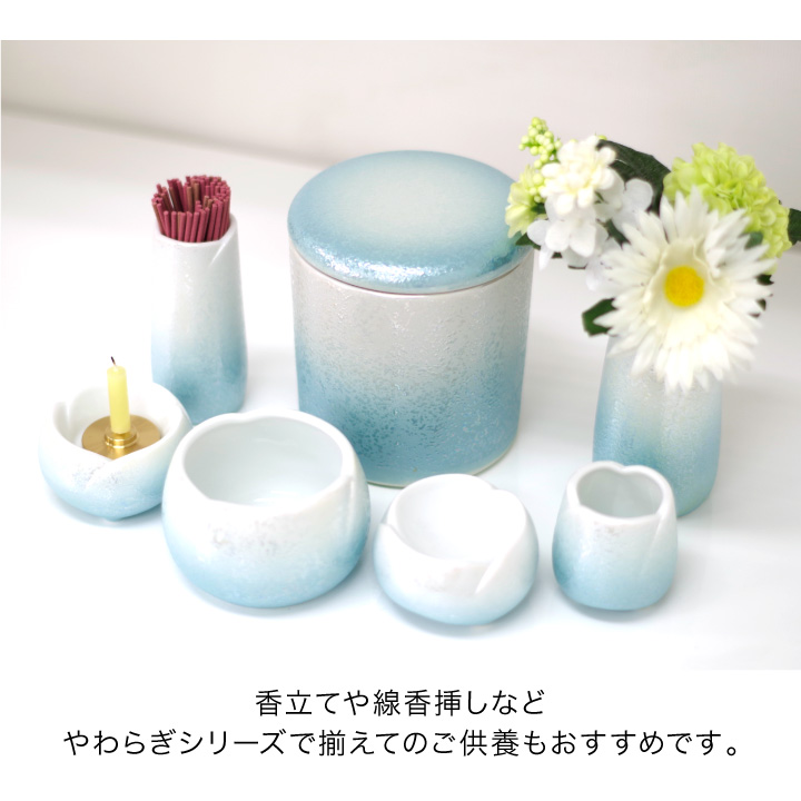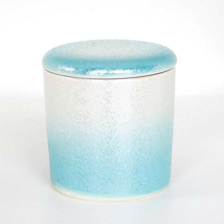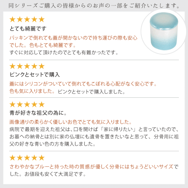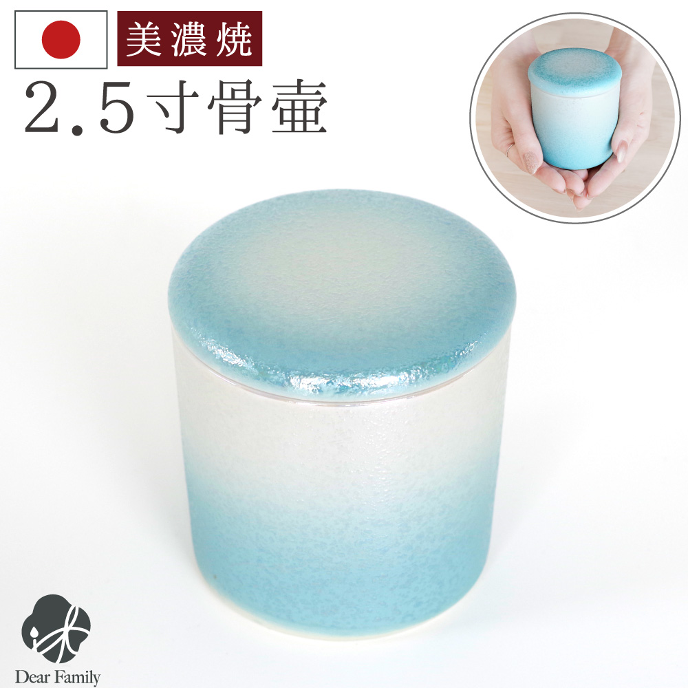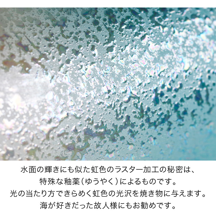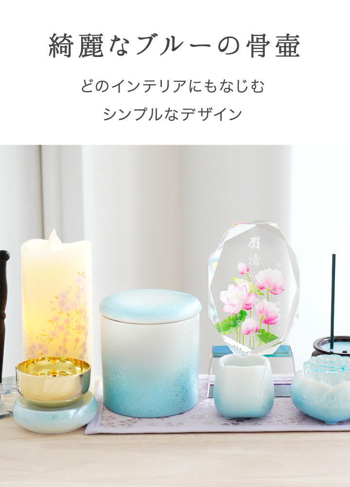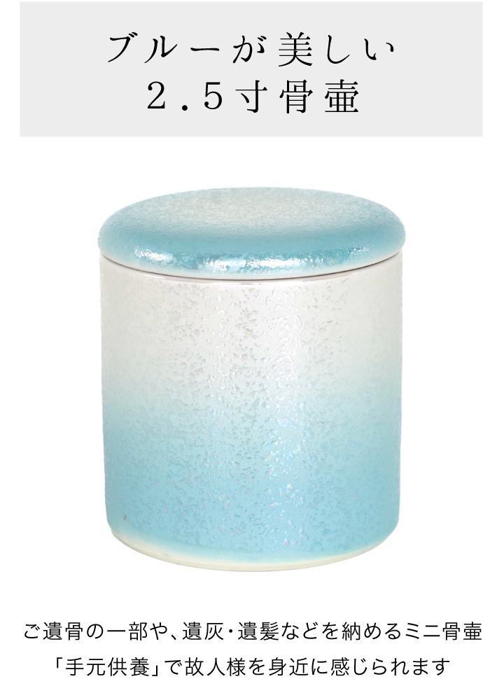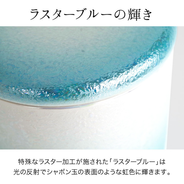 光の加減で虹色にきらめくブルーがとてもきれいな骨壷です。