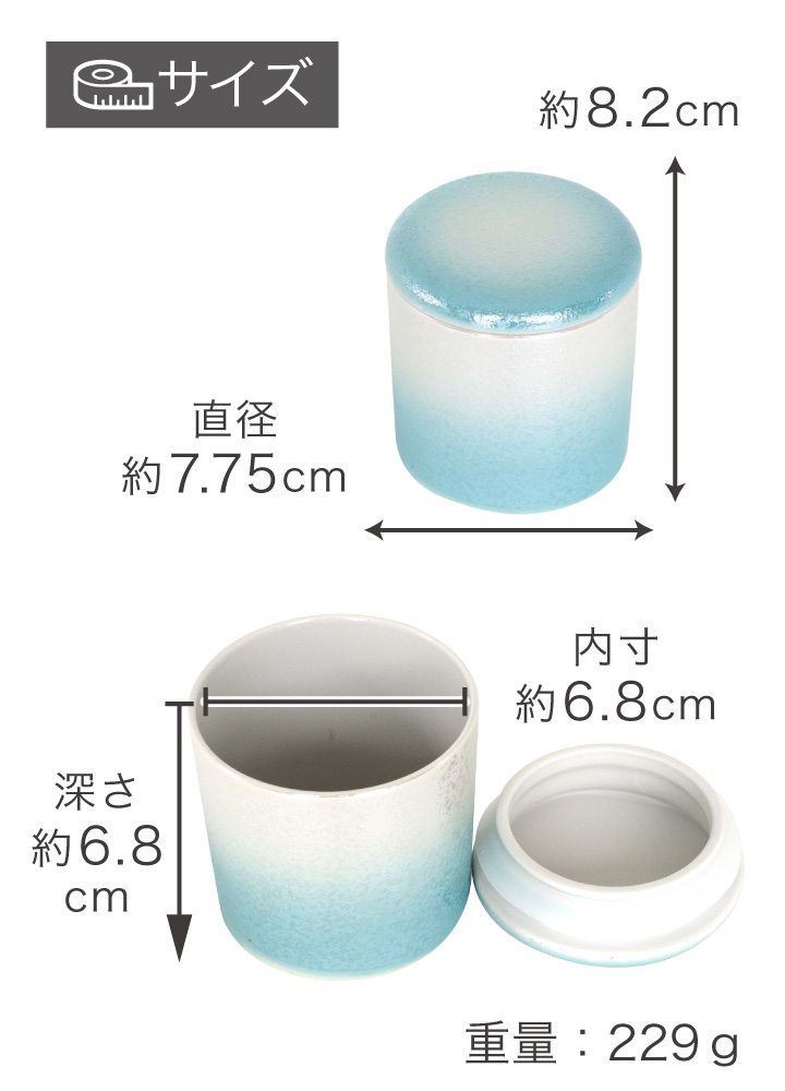 全体サイズ:直径 約7.75cm×高さ 約8.2cm 内側のサイズ:直径 約6.8cm×深さ 約6.8cm 重量:229g |