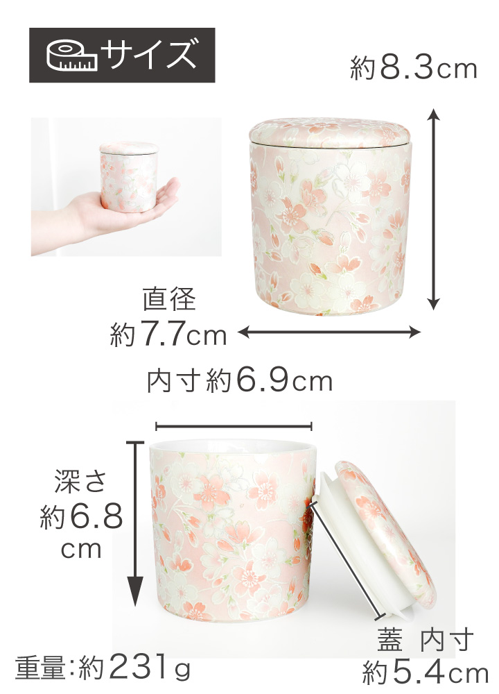 ・全体サイズ:直径 約7.7cm×高さ 約8.3cm ・内部サイズ(内寸):直径 約6.9cm×深さ 約6.8cm ※陶器ですので若干の違いはございますが、「2.5寸」という規格で製作しております。 |