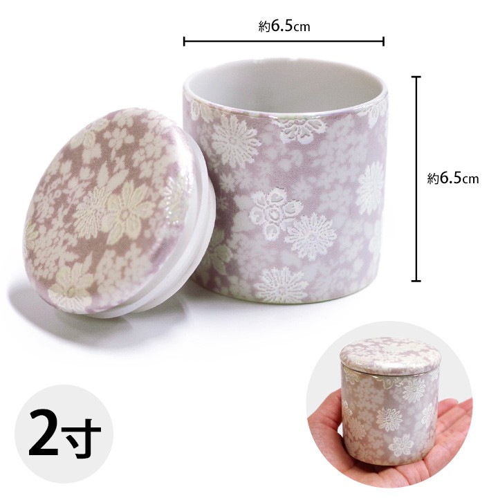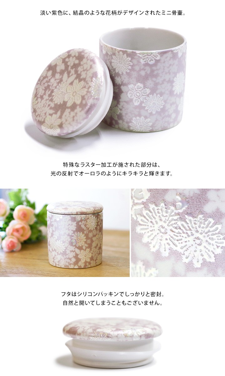TOP 骨壷素材から探す陶器製 骨壷色から探す白・透明系 ミニ骨壷 2寸 華結晶 紫 国産骨壷 ミニ骨壷 分骨 遺骨 骨 仏具 手元供養 供養 四十九日 法要 柄 ラスター キラキラ 小さい ミニ 骨入れ 火葬 陶器 シリコン パッキン パール パープル オーロラ 花柄 結晶 ムラサキ ケース 喉仏 天使ママ 価格: ¥4,400 (税込) [ポイント還元 44ポイント〜] 販売期間: 22: 5: 数量: 個 在庫: 在庫あり 在庫 在庫あり 返品についての詳細はこちら サイズ 直径約6.5cm×(2寸)蓋の内寸直径:約4cm重量:151g 素材 陶器、シリコン 色 淡い紫 備考 ■日本製(岐阜県)※骨壷の柄には特殊な加工を施しており、一部つなぎ目がございます。※職人がひとつずつ手作業で製作しているため、大きさにバラつきがございます。