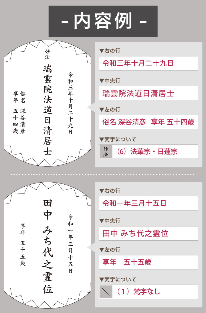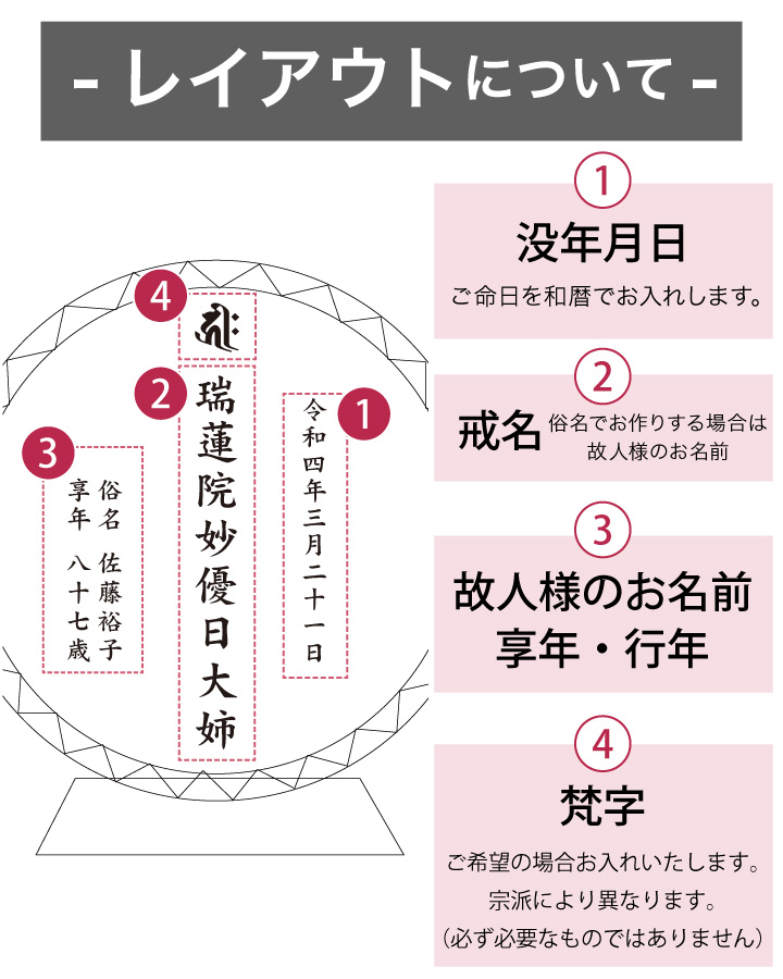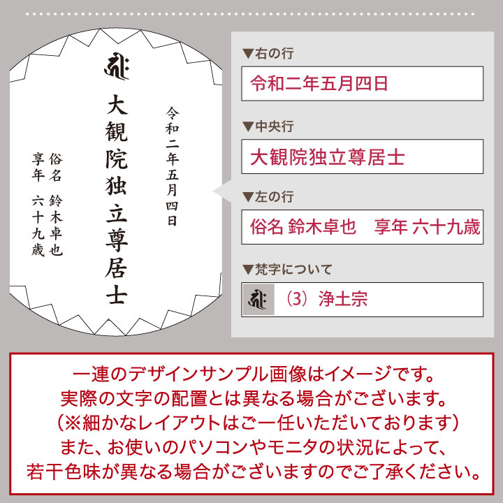1. 購入ボタン付近にある[入力欄]に、お位牌に入れる内容を記載して、ご注文を完了させてください。 【お名前のみ】や【享年なし】など、自由にご指定いただけます。 (その場合、空にしたい行の入力欄には何も書かないでください) 「備考欄」や「メール」でのご指示も可能です。 ▼記入例 ーーーーーーーー □□□□□□ ○○年○○月○○日 ーーーーーーーー メールでお送りいただく場合は、ご注文番号・お名前をお書き添えのうえorder@inlovingmemory.co.jp宛にお送りください。 ※ご記入頂いた通りに製作いたします※ 戒名の霊位も、ご記入があればそのまま彫刻いたします。 ご記入内容にお間違いがないよう、お気をつけ下さいませ。 ↓↓↓ 2.完成をイメージした画像(イメージ原稿)をお作りし、メールでお送りしますのでご確認ください。 ・イメージ原稿はお間違えがないかをご確認いただくものです。十分に注意をしておりますが、お名前や数字などの内容に誤りがないか、必ずよくご確認ください。 ・修正は2回まででお願いをしております。 ・確認いただくのは原稿となりますため、実際の色味とは少々異なる場合がございます。 ↓↓↓ 3.承認の連絡後、製作開始 ・お送りした原稿でよろしければ、承認のご連絡をお願いします。 ご承認頂けない場合は製作できませんので、必ずご連絡ください。 ↓ 4.お届け 原稿の承認から約2週間程で完成・発送いたします。 |