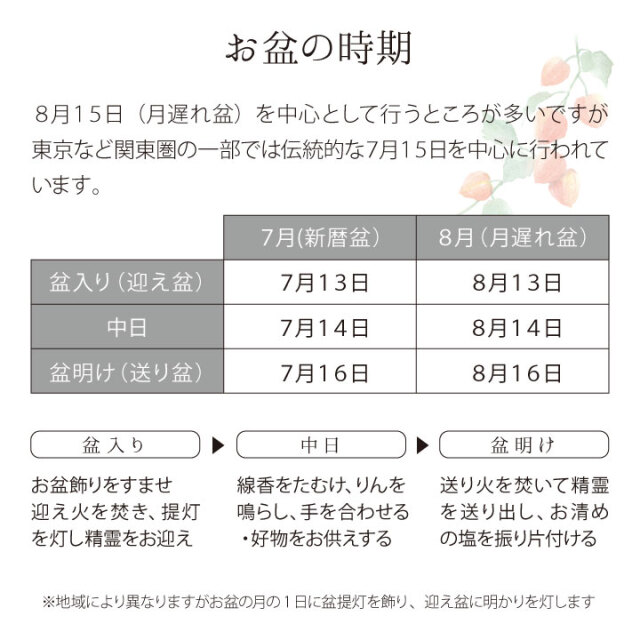 お盆とは、東京では7月13日から16日、その他の地域では8月13日から16日までに行われるのが一般的です。