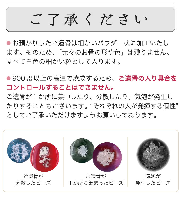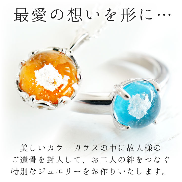 美しいカラーガラスの中に故人様のご遺骨を少量封入して、お二人の絆をつなぐ特別なジュエリーをお作りいたします。