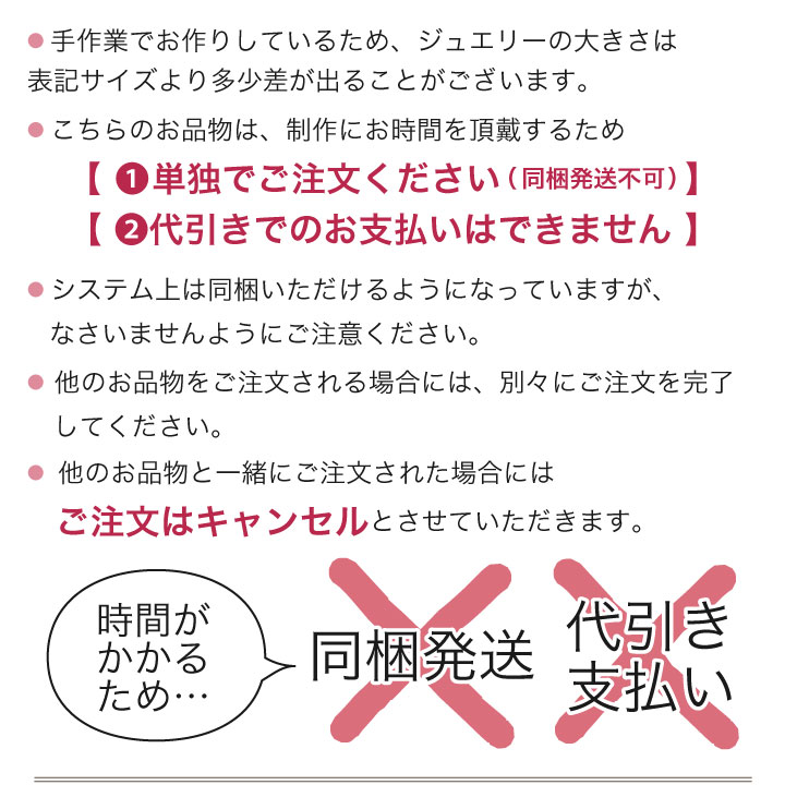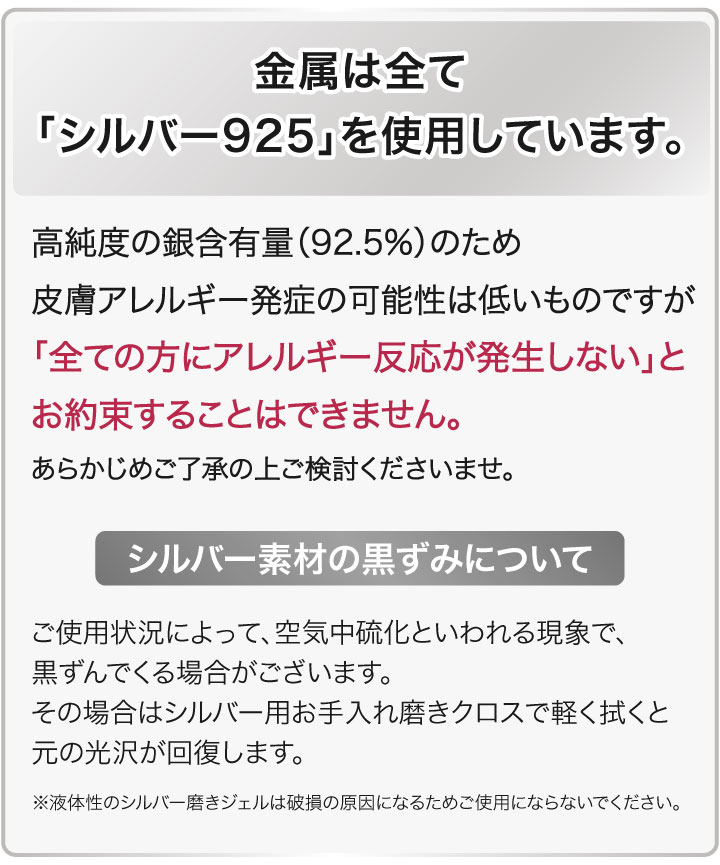 また、ペンダントの場合、腕に強く引っかかったりしてチェーンが切れてしまうことがございますのでご注意くださいませ。